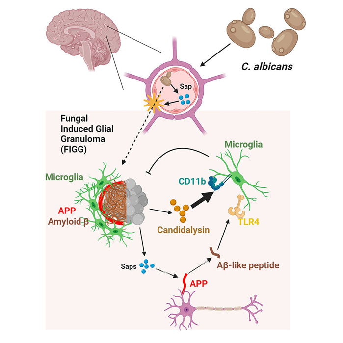 那么,如何有效地将真菌从大脑中清除?Corry和他的同事此前曾证明,健康小鼠的白色念珠菌脑部感染在10天后即可完全消退,这种情况是由于脑细胞中称为小胶质细胞的真菌触发的两种机制所致。“真菌破坏血脑屏障的汁液也会将淀粉样前体蛋白分解成抗体样肽,” Yifan Wu表示。“这些肽通过一种名为Toll样受体4(Toll-like receptors, TLR)的细胞表面受体激活小胶质细胞,从而使大脑中的真菌负荷保持在较低水平,但它不能清除感染。”
